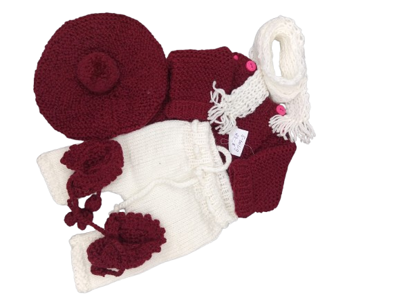 Dieses zauberhafte Strickset wurde speziell für Puppen entworfen und besteht aus einer bordeauxroten Mütze mit Bommel, einem kuscheligen Oberteil mit Knöpfen, einer weißen Strickhose sowie einem passenden weißen Schal mit Fransen. Abgerundet wird das Set durch bordeauxrote Puppenschuhe mit süßen Blütendetails.