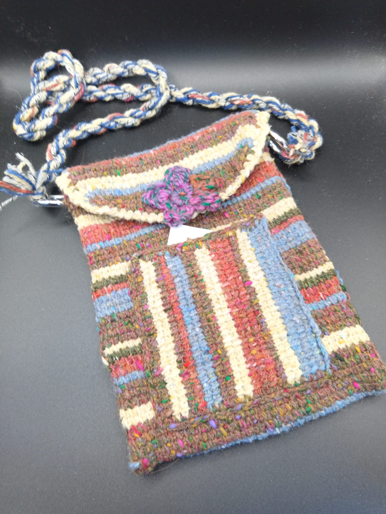• Blüten-Akzent: Ein dunkelviolettes, gehäkeltes Blumen-Detail ziert den oberen Rand der Tasche.
