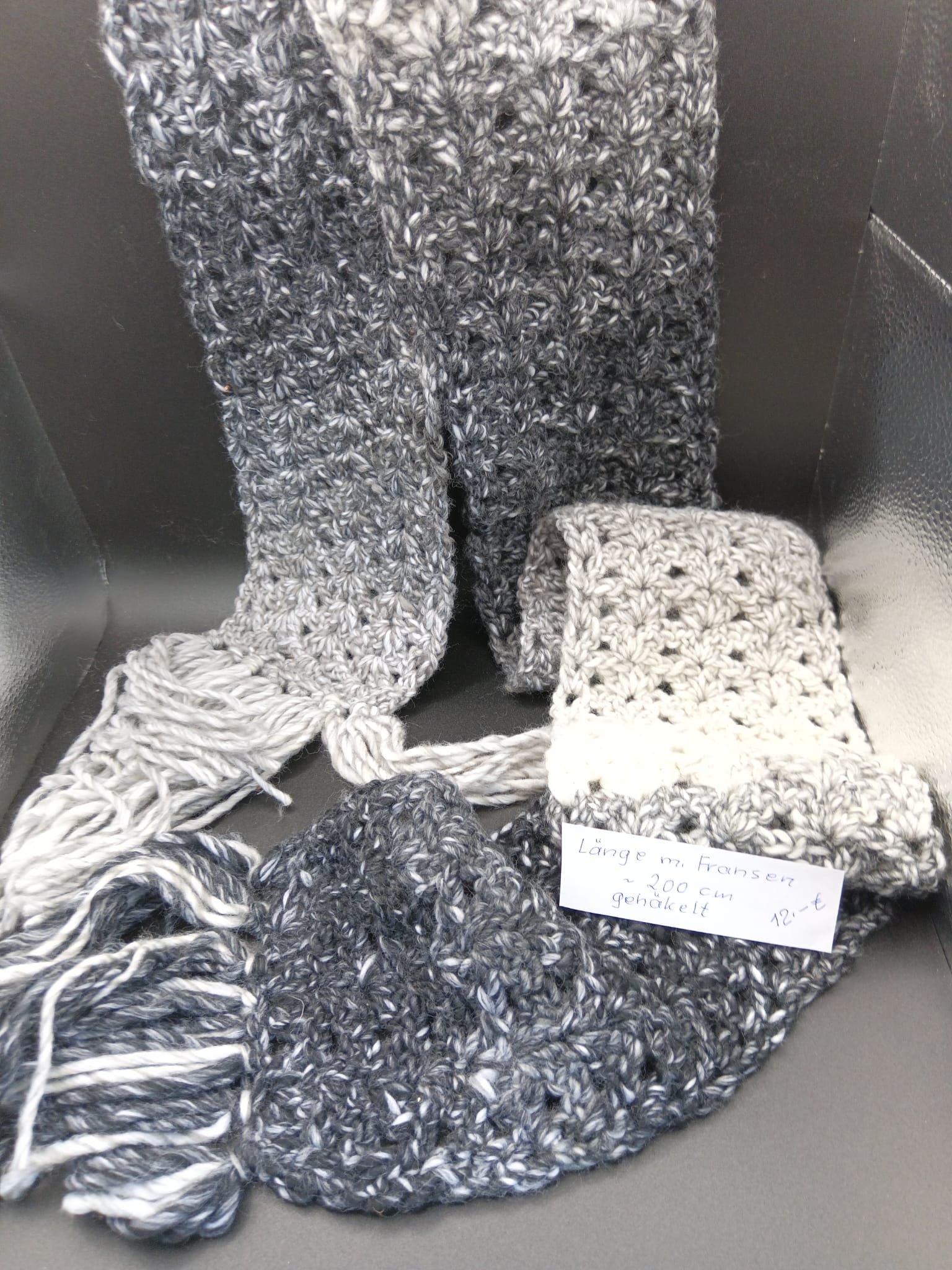 Farben und Muster: Der Schal ist in Graustufen, die dynamisch zwischen Dunkelgrau/Anthrazit, Mittelgrau und Weiß/Hellgrau wechselt.