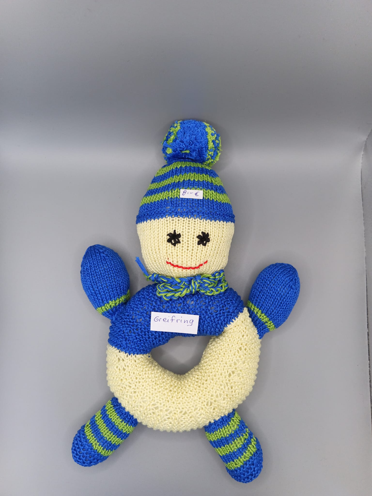 Farben: Blau, Gelb/Creme, Grün Technik: Handgefertigt (gestrickt/gehäkelt) Ideal für: Erste Greifversuche, als Rassel-Ersatz und als schönes Geschenk zur Geburt oder Taufe.