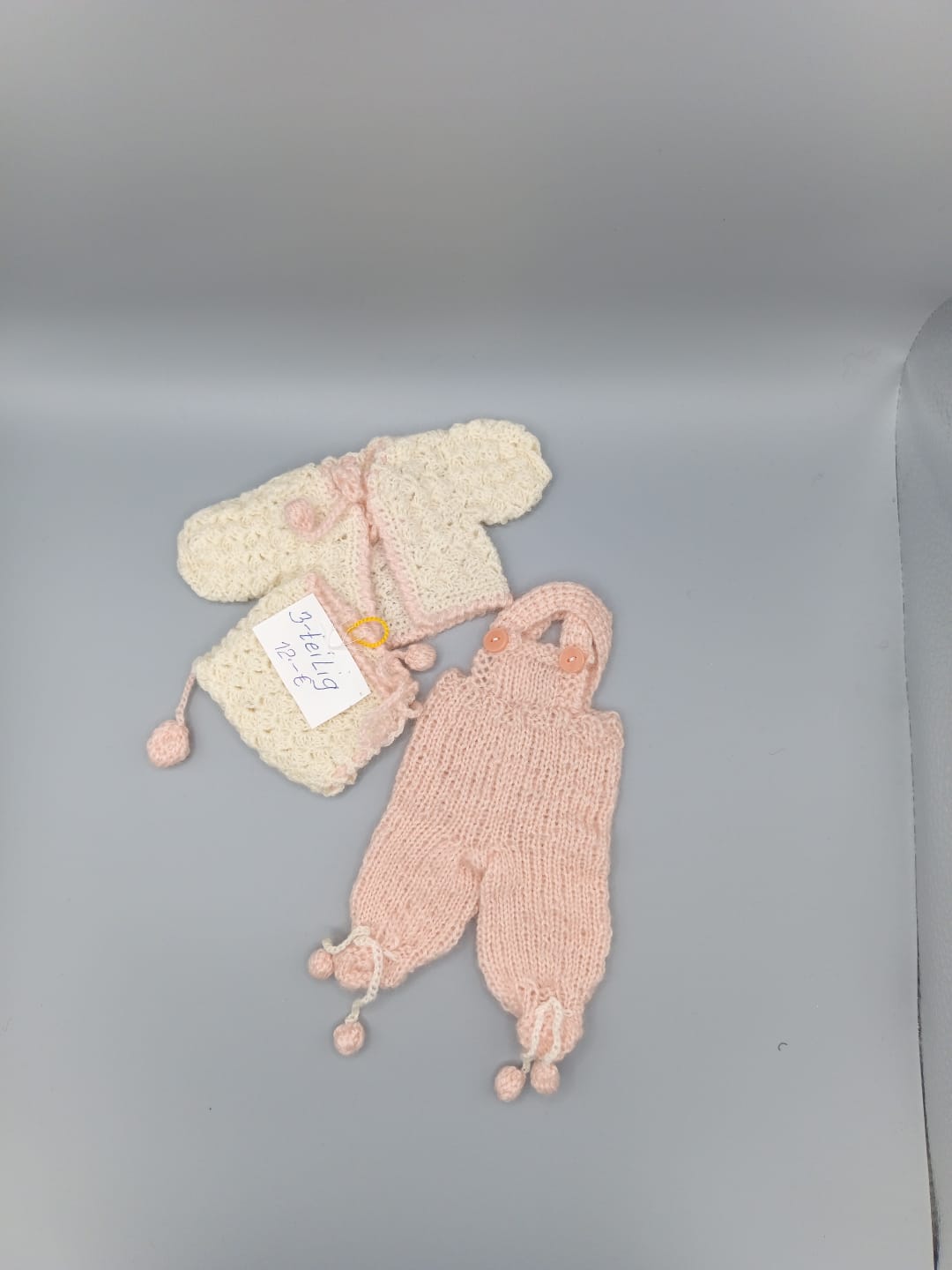 Dieses handgehäkelte Puppen-Outfit besteht aus einer cremefarbenen Jacke mit zartrosa Kanten, einer passenden Haube mit Bommel und einer rosafarbenen Latzhose mit verspielten Details an den Beinenden. Die weiche Wolle und die liebevolle Verarbeitung machen das Set zu einem gemütlichen und stilvollen Begleiter für jede Puppe.
