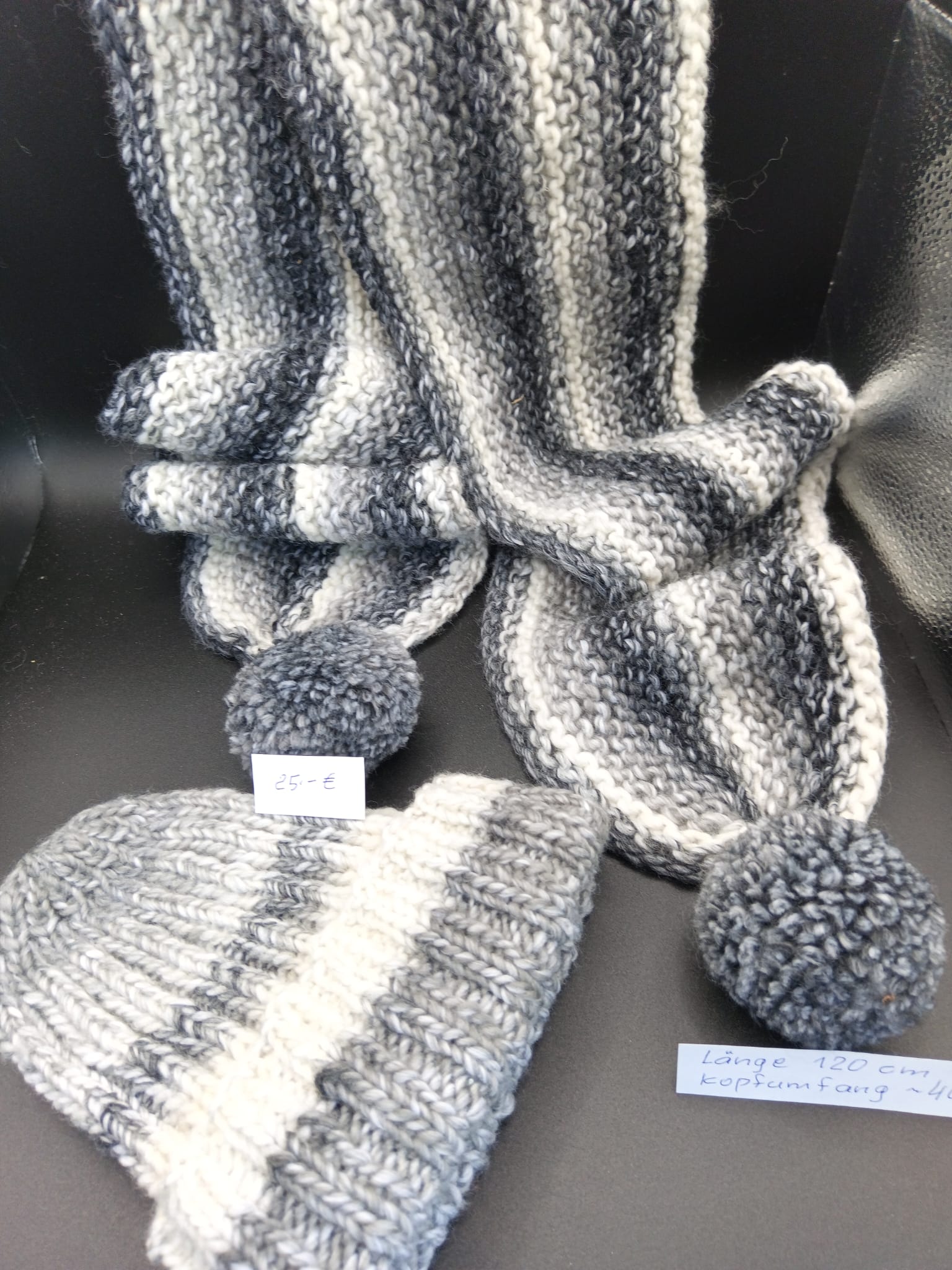 Produktart: Zweiteiliges, handgestricktes Set bestehend aus einem Schal und einer Mütze.