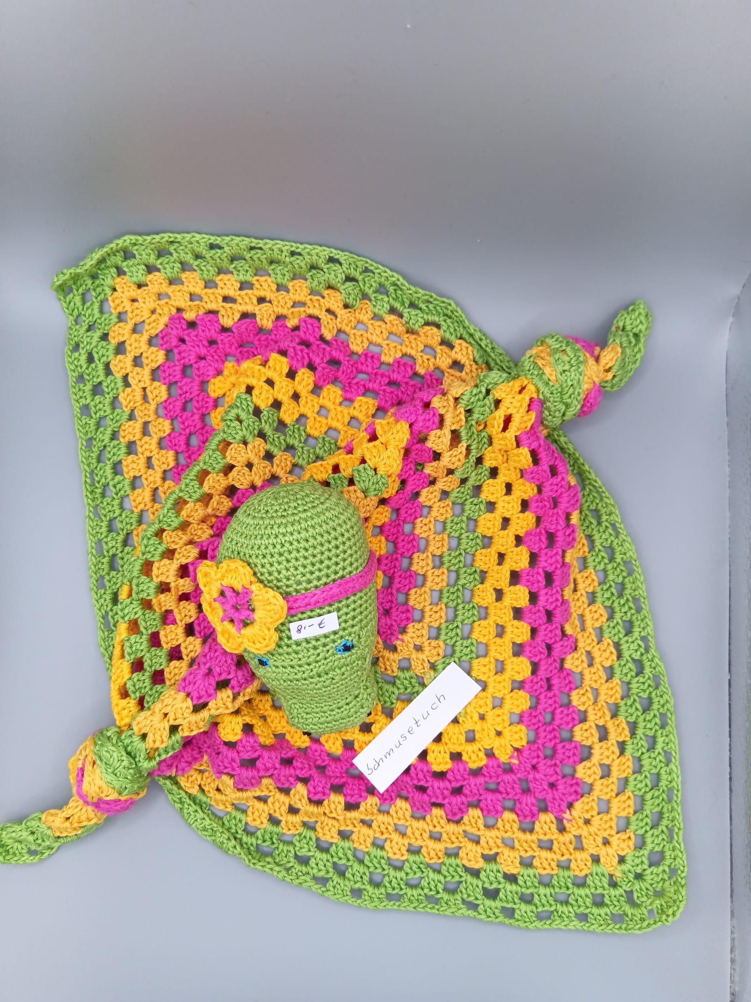 Artikelbezeichnung: Handgehäkeltes Schmusetuch mit Krokodil-Kopf – Bunt