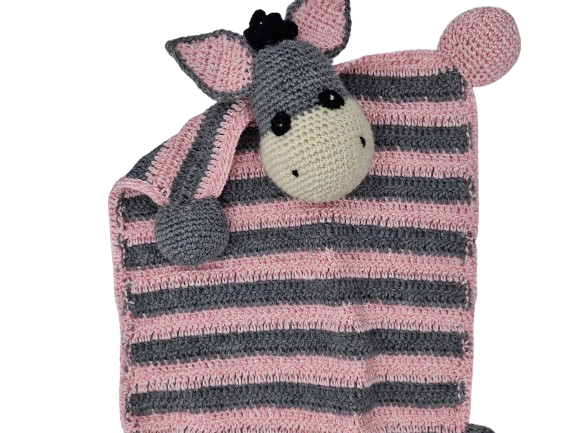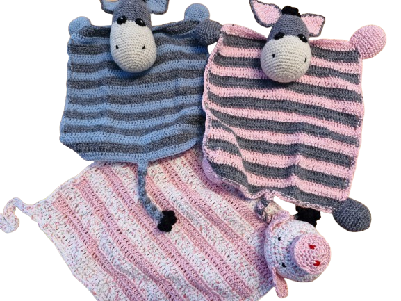Gehäkelte Schnuffeltücher für Babys und Kleinkinder. Diese liebevoll gestalteten Schmusetücher haben niedliche Tierköpfe, darunter einen Esel und ein Schweinchen, die als kuschelige Begleiter für die Kleinen dienen.