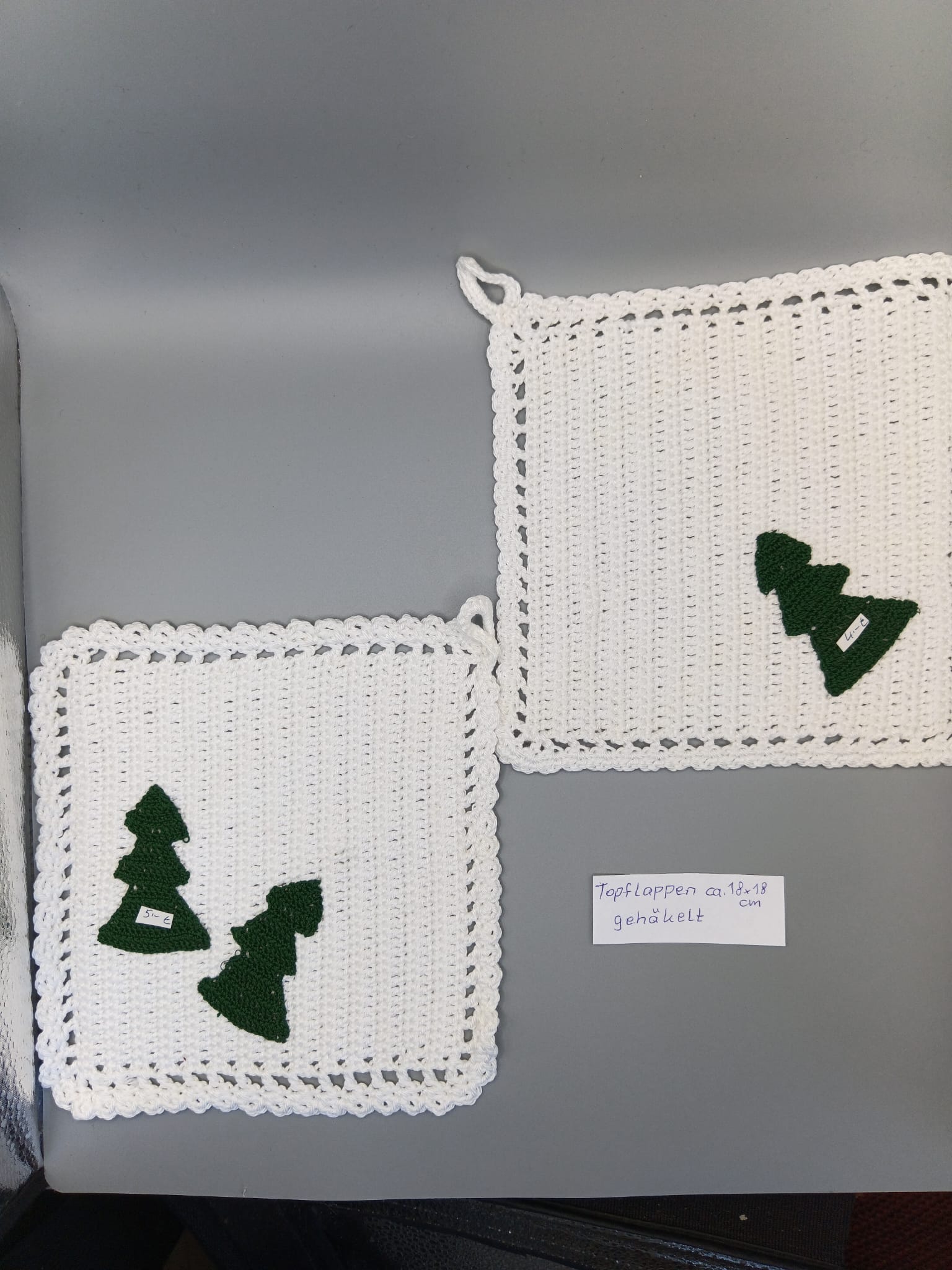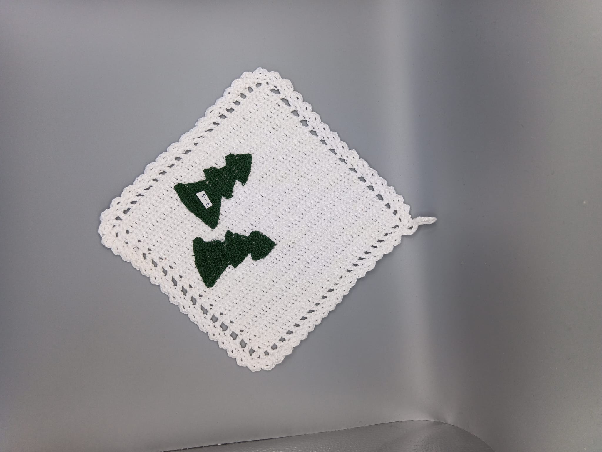 Artikelbezeichnung: Handgehäkelter Topflappen mit zwei Tannenbäumen – Weiß/Grün