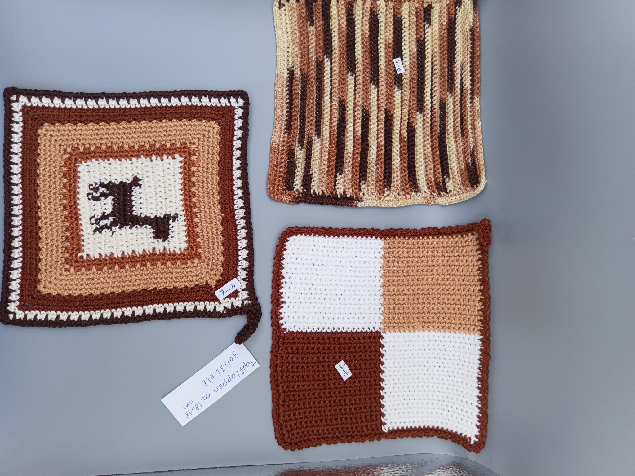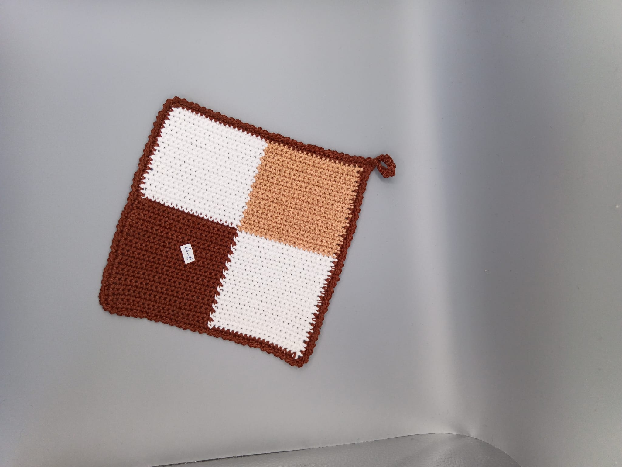 Artikelbezeichnung: Handgehäkelter Topflappen im klassischen 4er-Block-Design – Braun-Weiß