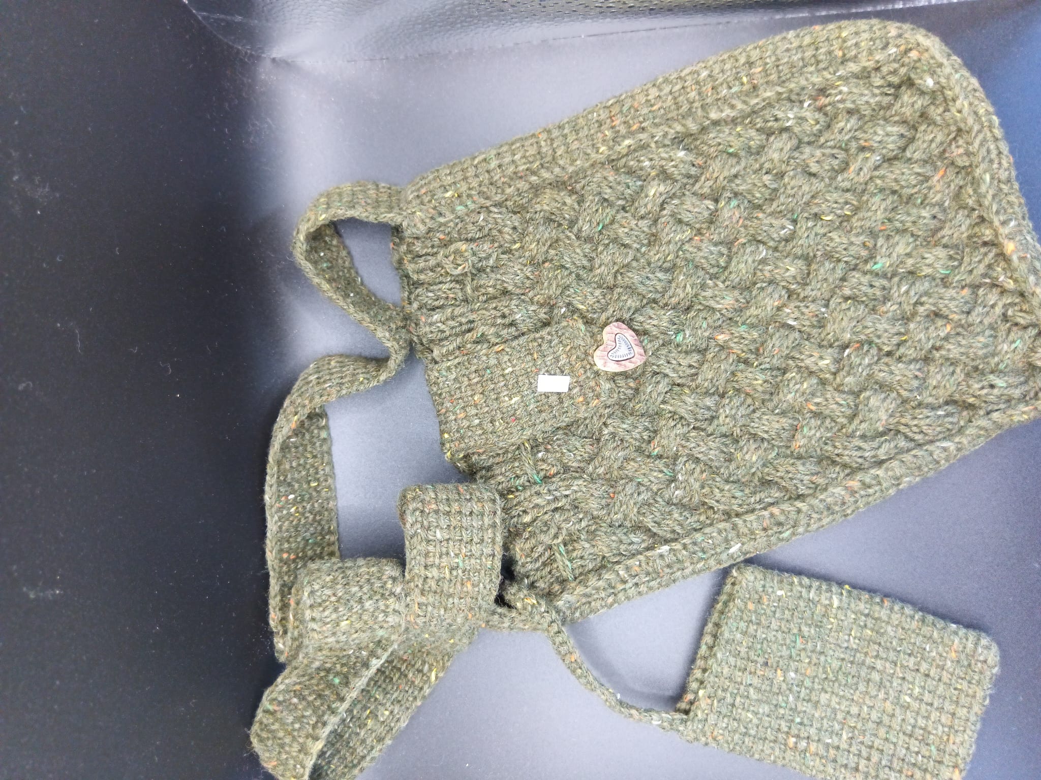 Artikelbezeichnung: Handgehäkelte Schultertasche mit Flechtmuster & Etui – Olivgrün Tweed