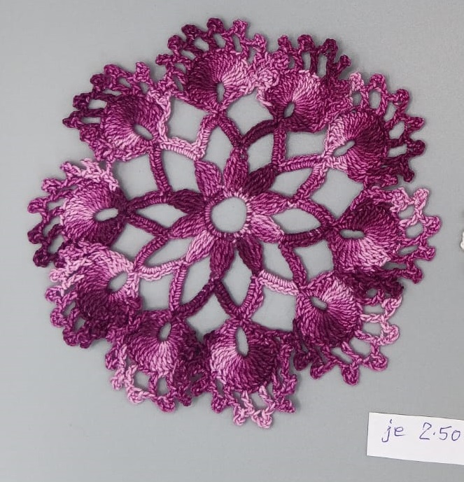 Design: Die runde Form ist in ein offenes Spitzen- oder Blütenmuster gearbeitet, das einen sternförmigen Kern und dekorative Bögen am äußeren Rand bildet.