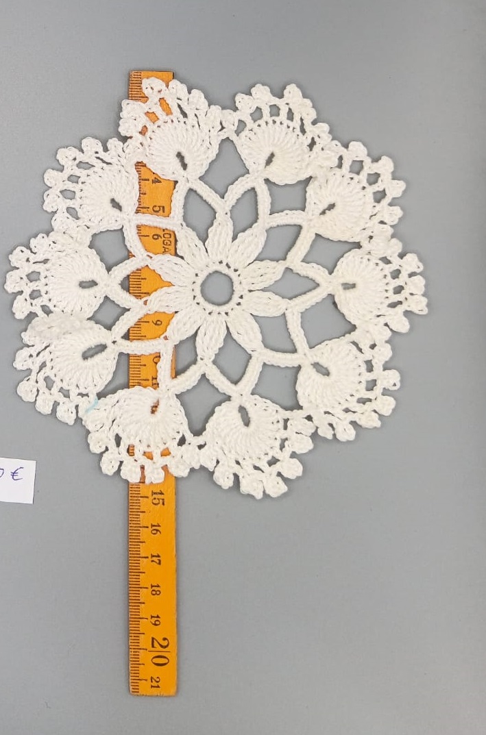 • Design: Die runde Form zeigt ein komplexes, stern- oder blütenförmiges Spitzenmuster. Die Mitte wird von großen, runden Elementen und einem dekorativen, fächerartigen Außenrand umrahmt.